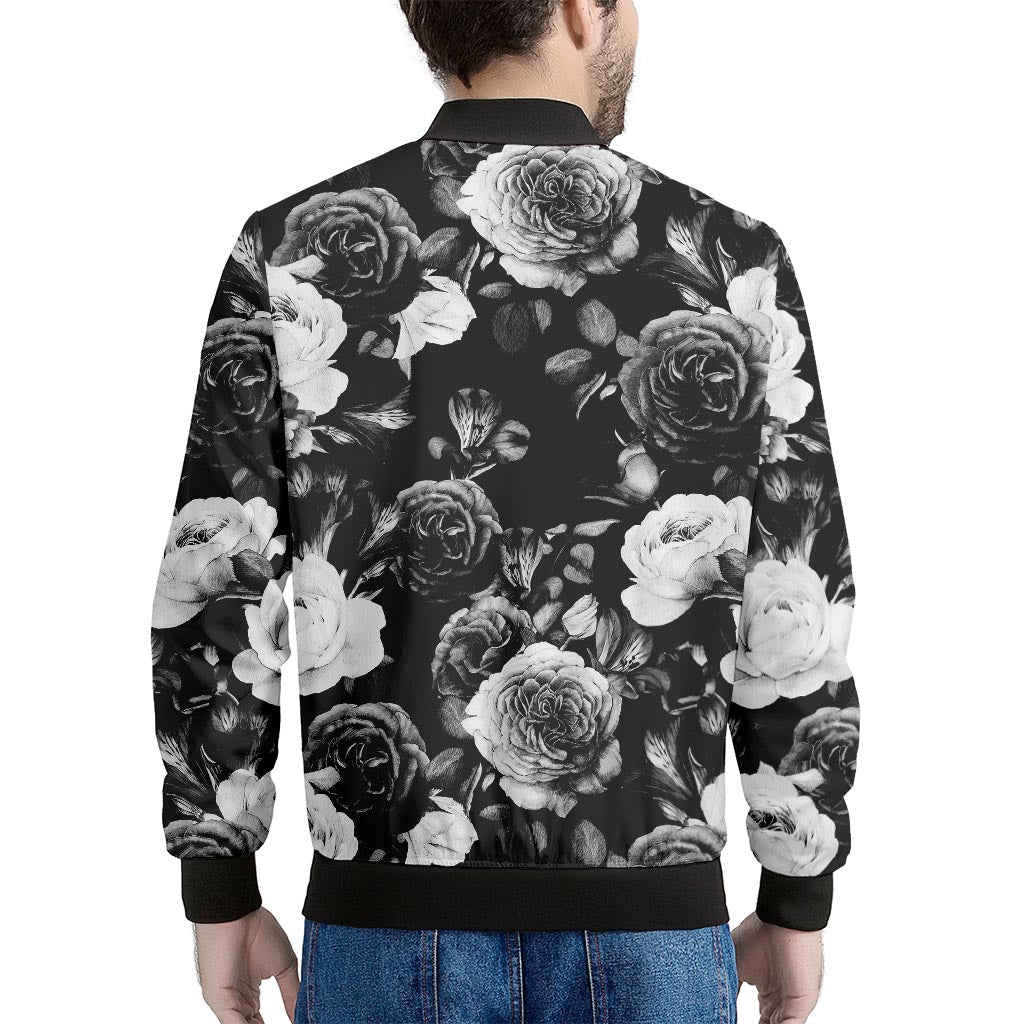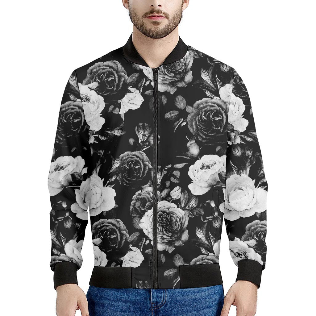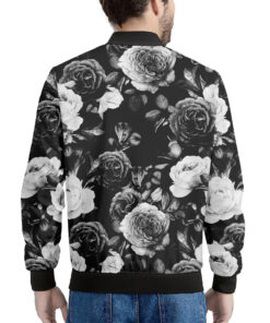 Black White Rose Floral Pattern Print Men’s Bomber Jacket